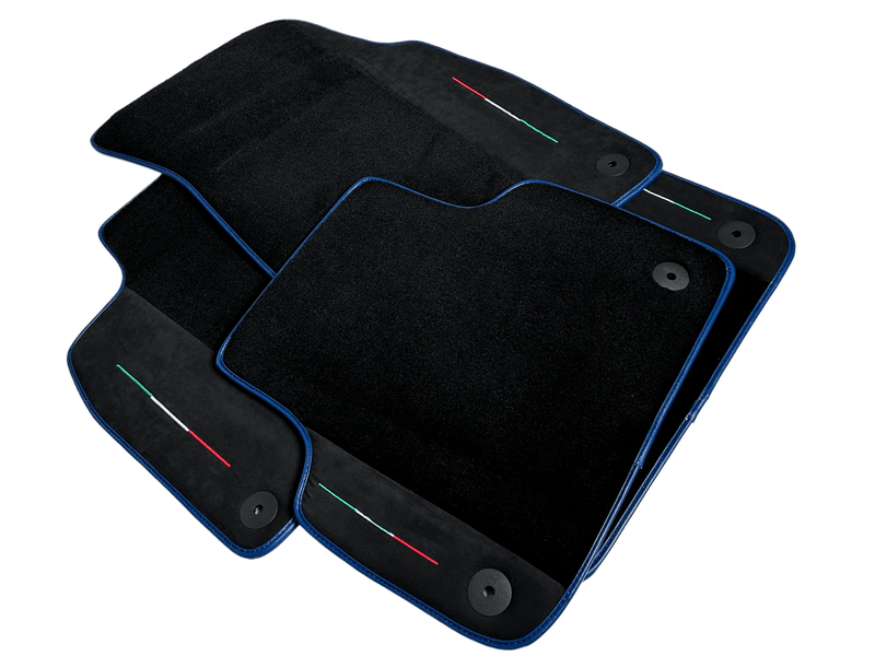 Czarne maty samochodowe do Lamborghini Urus z wkladem skórzanym Alcantara i ciemnoniebieskim wykończeniem