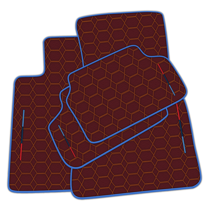 Upgrade your BMW's interior with these luxurious Burgundy Leather Floor Mats. With a striking Hexagon Hex Pattern and added orange stitching and blue trim, these mats enhance the overall look and feel of your car. And with the added Tricolor M logo, it's the perfect addition for any BMW enthusiast.