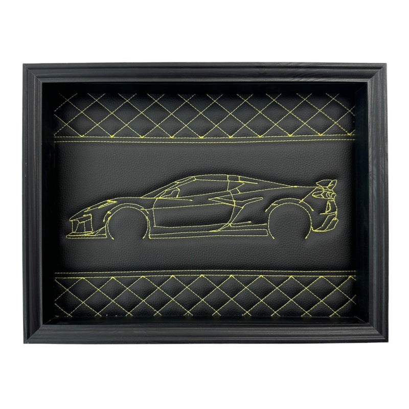 Black Leather Corvette C8 Inspired Wall Art: Embroidered Yellow Stitch
