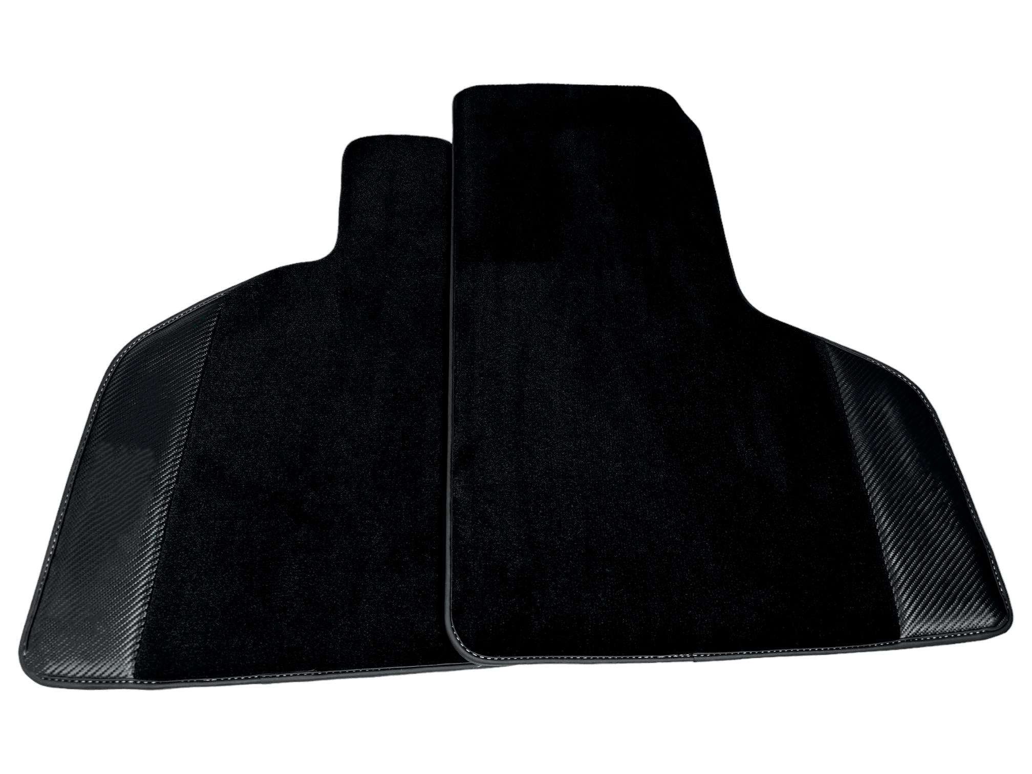 Enhance the interior of your Lamborghini Huracan STO with these Black Floor Mats featuring Carbon Fiber Leather and Orange Sewing. Enjoy a luxurious, high-end look while protecting your car's floors from dirt and wear. These mats are a perfect combination of style and functionality. Upgrade your ride today.