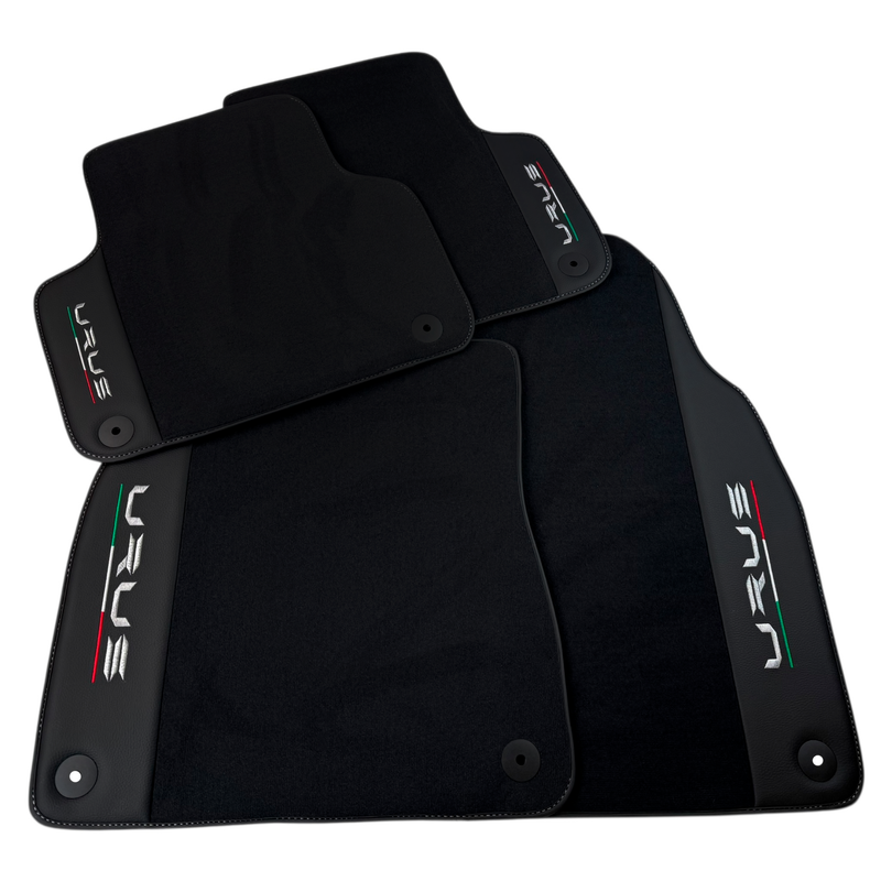 Custom-engineered black floor mats exclusively for the Lamborghini Urus, featuring premium leather construction with distinctive white trim accents. These precision-cut mats deliver exceptional floor protection while enhancing your vehicle's interior aesthetic. The contrasting white border highlights the sophisticated design, maintaining the performance luxury expected in your Urus while providing superior resistance to wear, moisture, and debris. Each set is crafted to exact specifications for a perfect fit in all footwells.