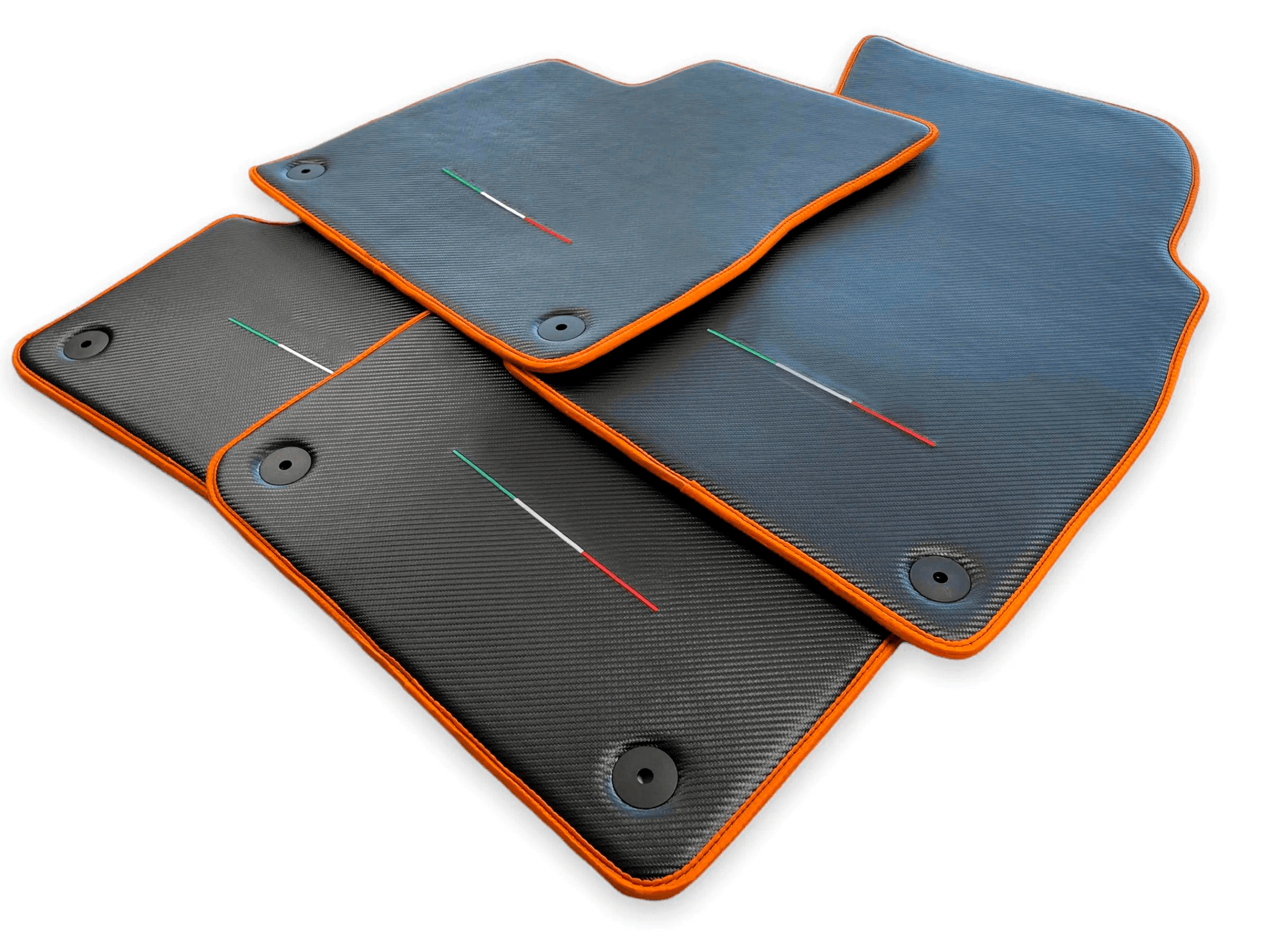 Expertly crafted for the Lamborghini Urus, these floor mats feature carbon leather and tailored orange trim. Protect your high-end vehicle while adding a touch of luxury. Made with precision and attention to detail, these mats are the perfect addition to your sports car.