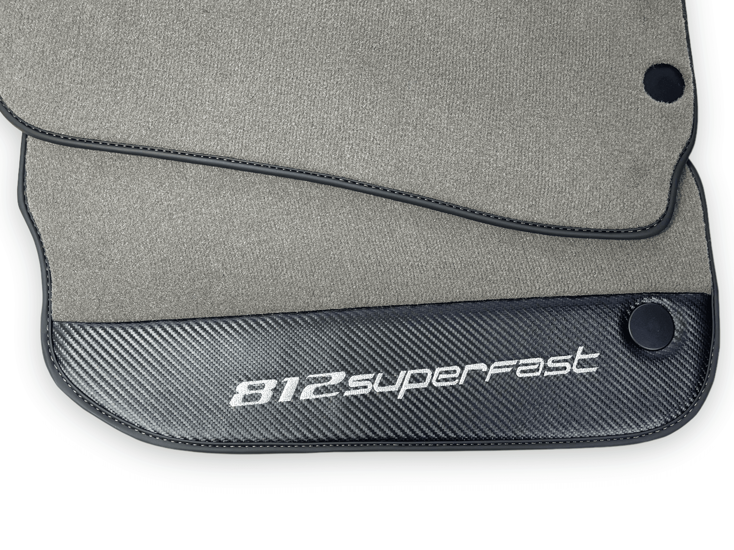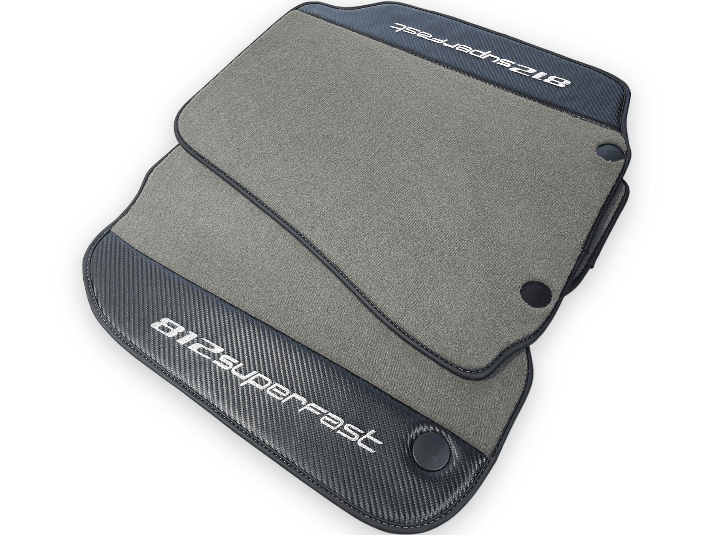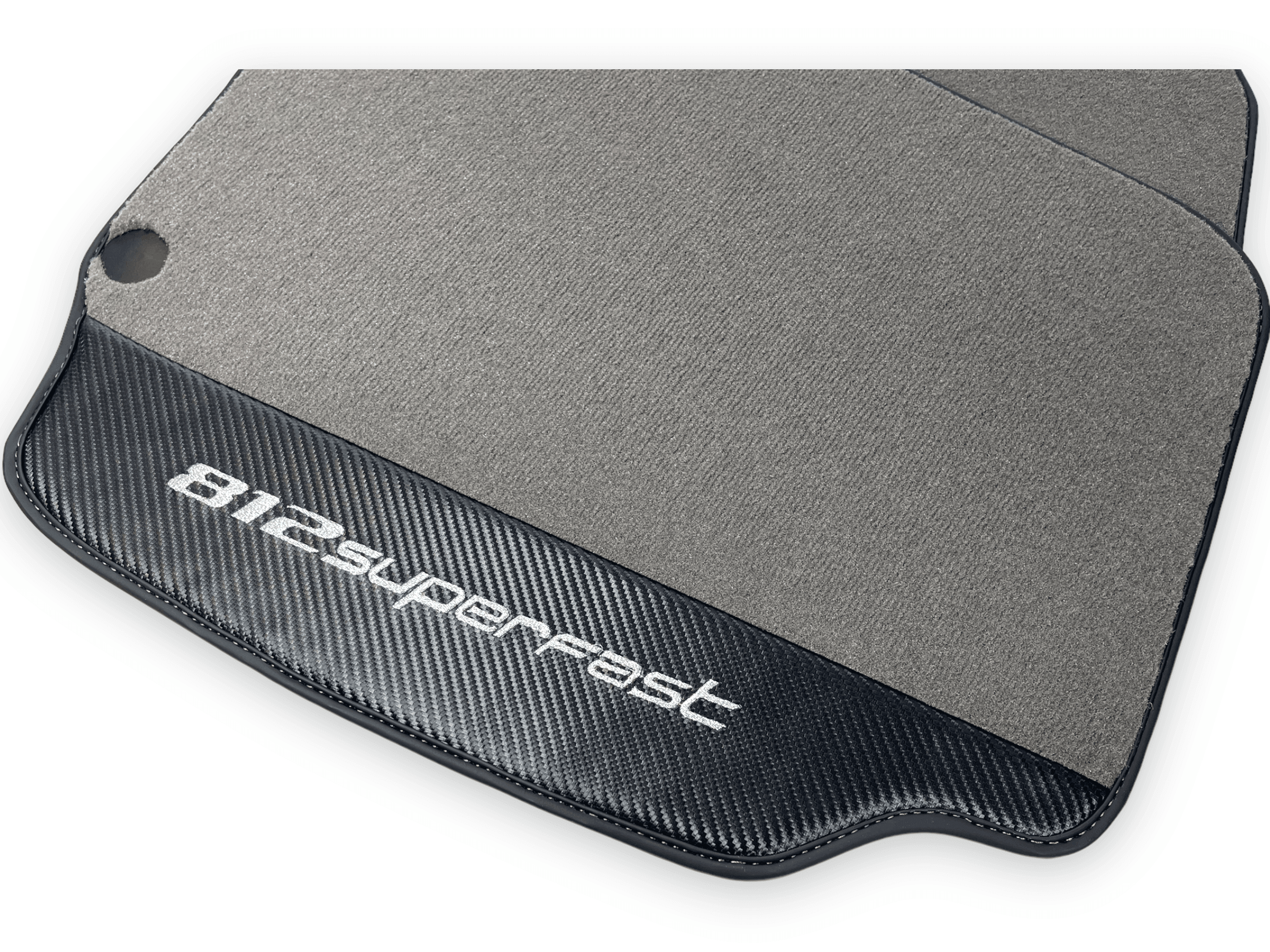 Expertly crafted for the Ferrari 812 Superfast, these gray floor mats add a touch of luxury with carbon fiber leather material. Enhance your driving experience with its sleek design and durable construction, perfect for any Ferrari enthusiast. Experience superior style and protection with these floor mats.
