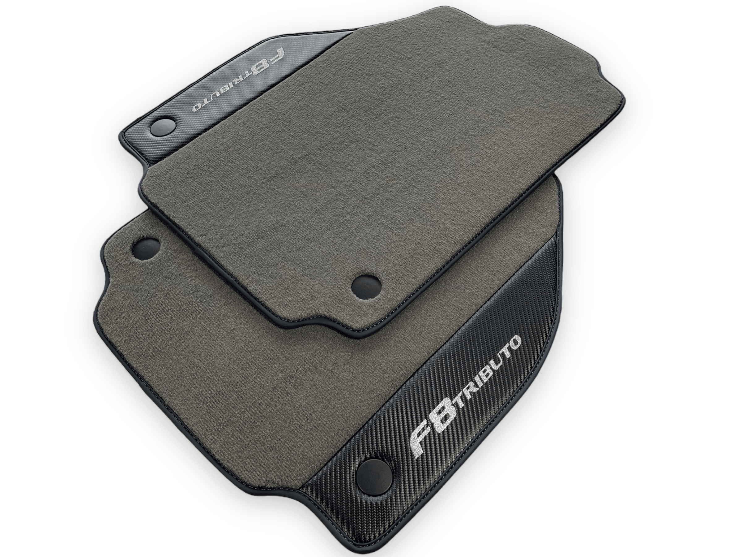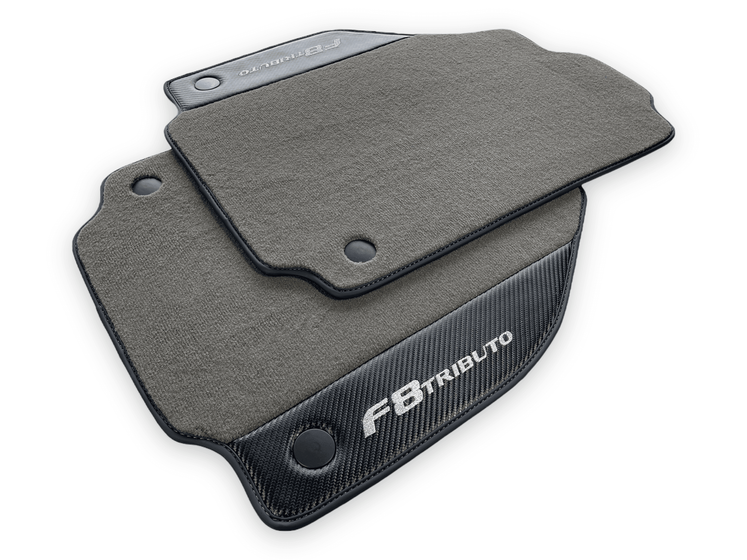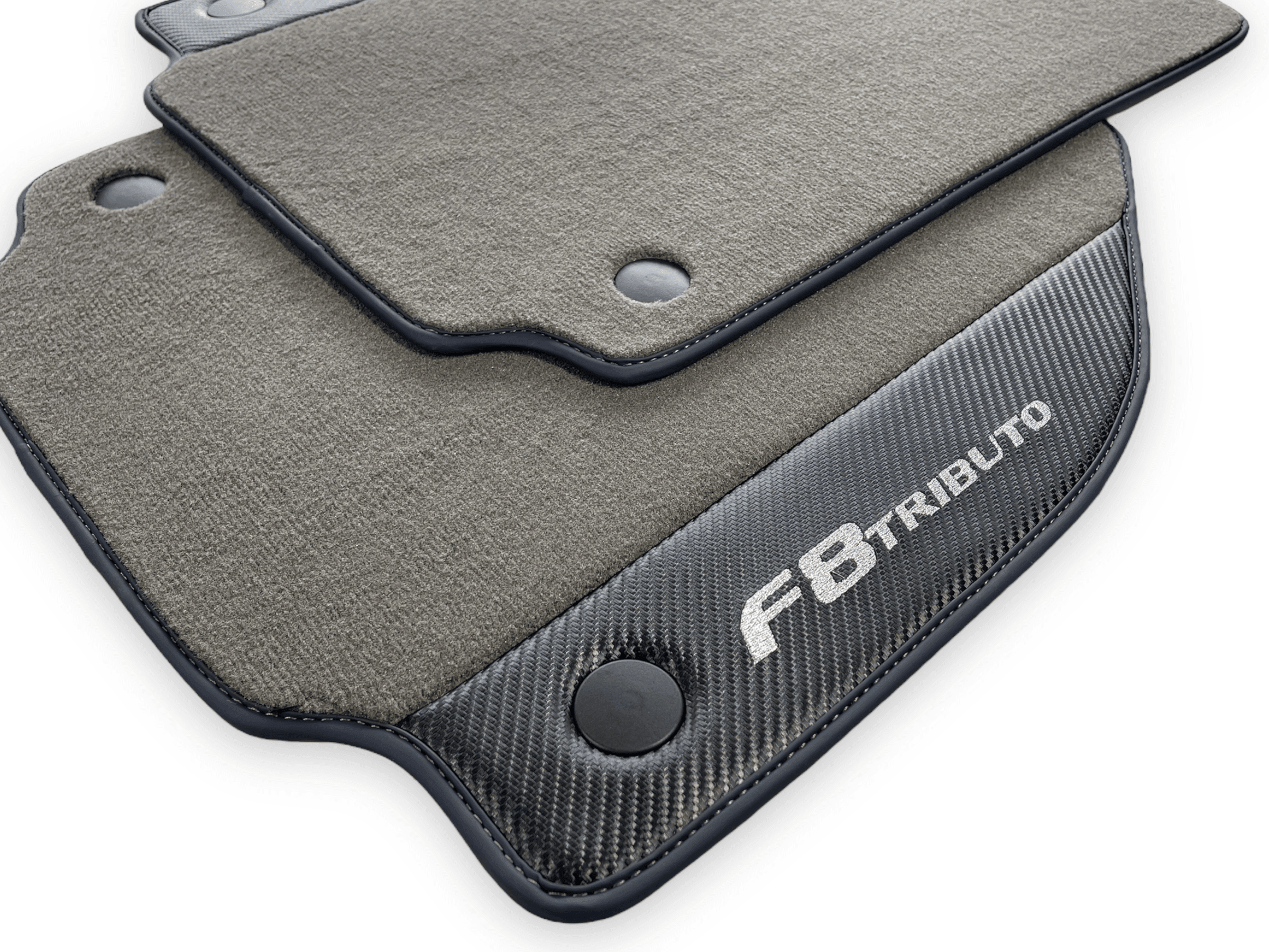 Introducing top-of-the-line gray floor mats for your Ferrari F8 Tributo. Made with carbon leather, these mats provide superior durability and style. Protect your car's floor while adding a touch of luxury with these custom-fit mats. Drive with confidence and style.