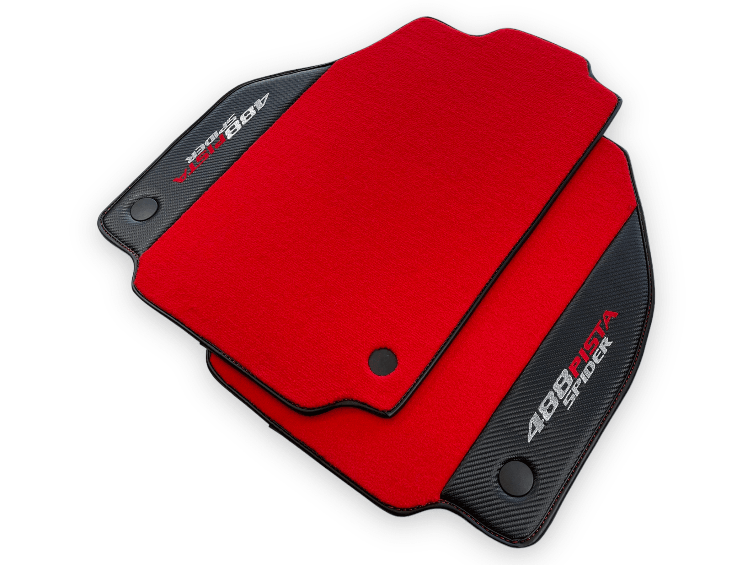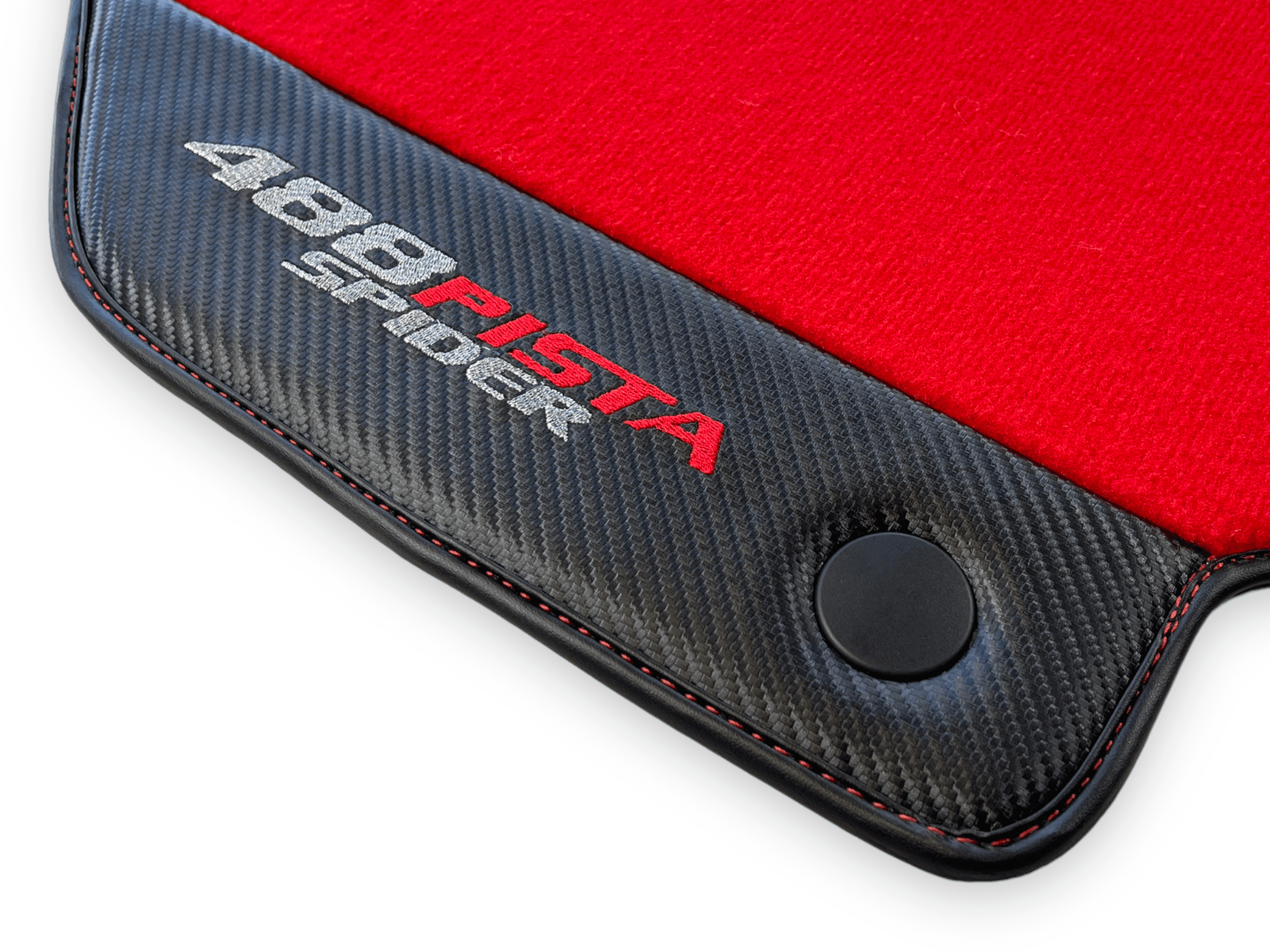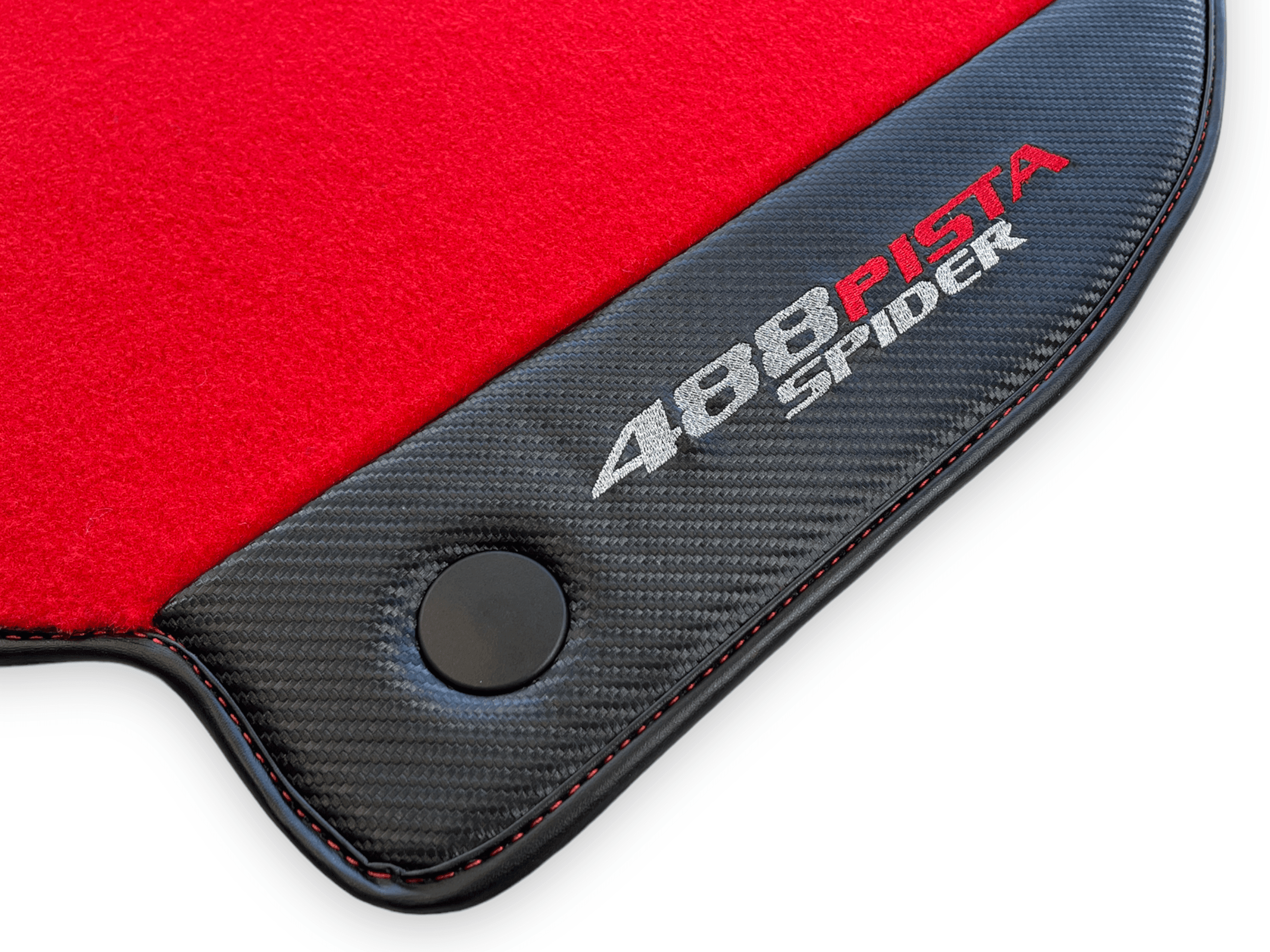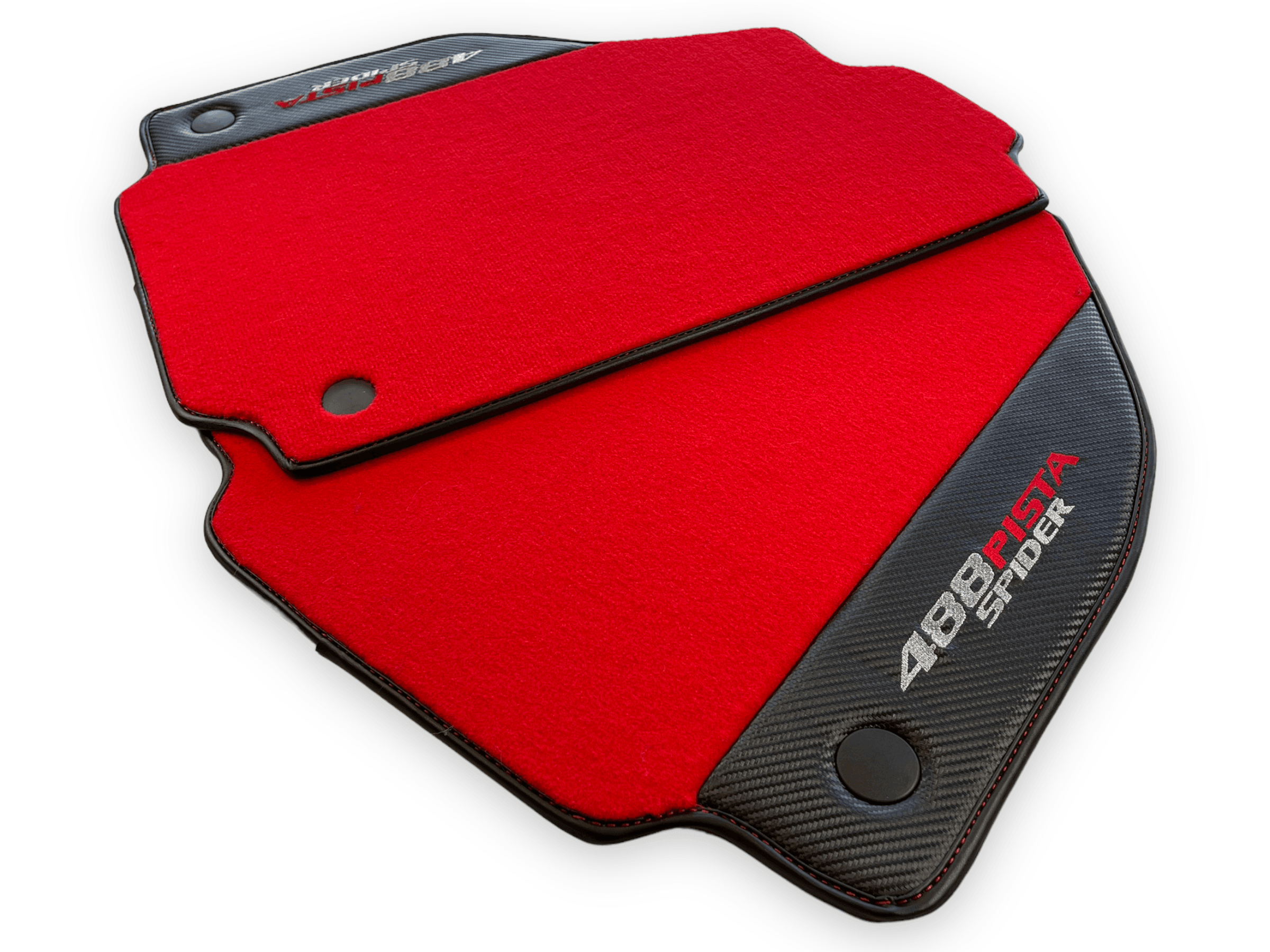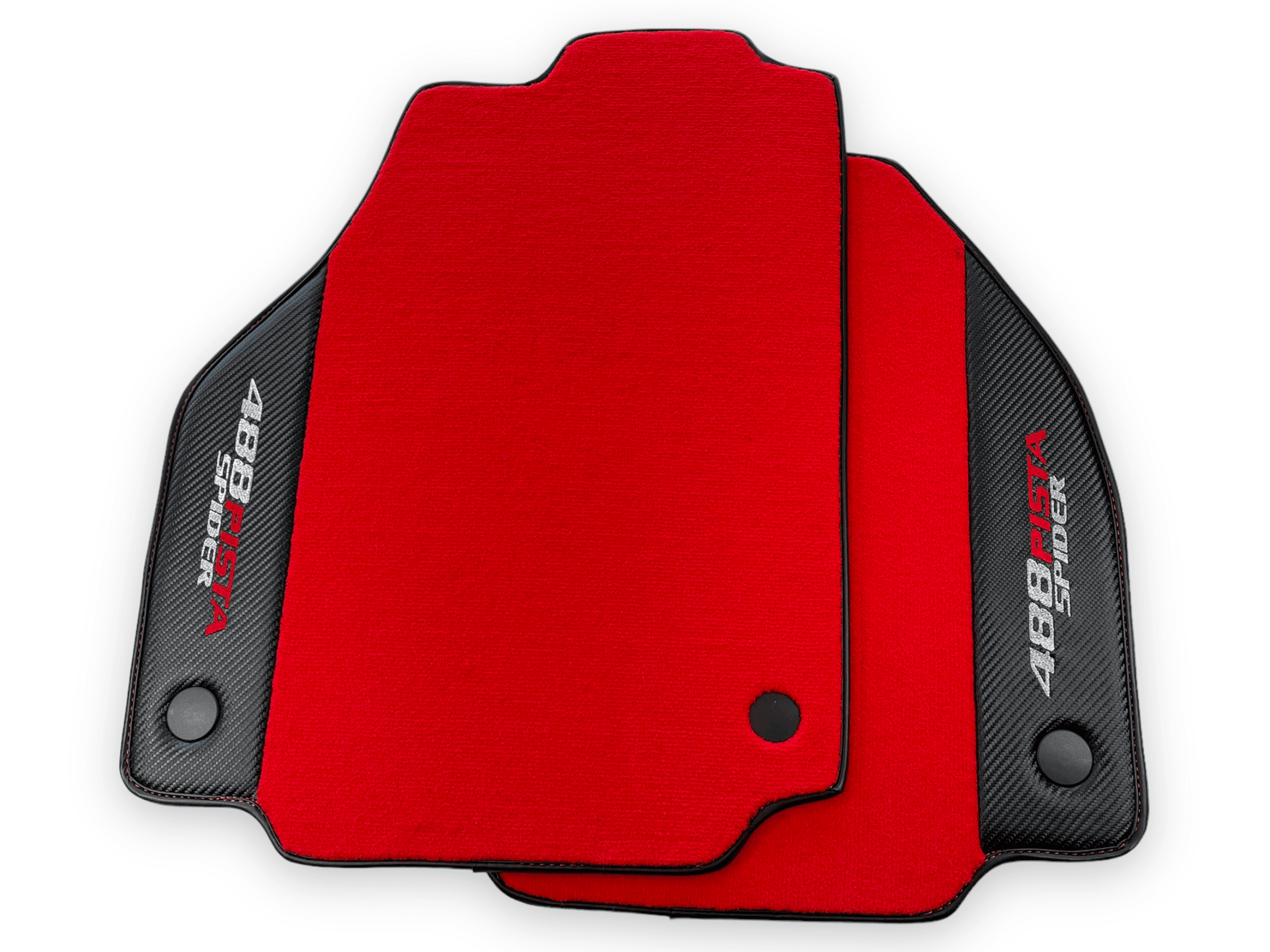 Expertly crafted for the Ferrari 488 Pista Spider 2019-2021, these red floor mats feature a luxurious carbon fiber leather material that adds a touch of sophistication to your vehicle's interior. Keep your floor protected while elevating your driving experience.