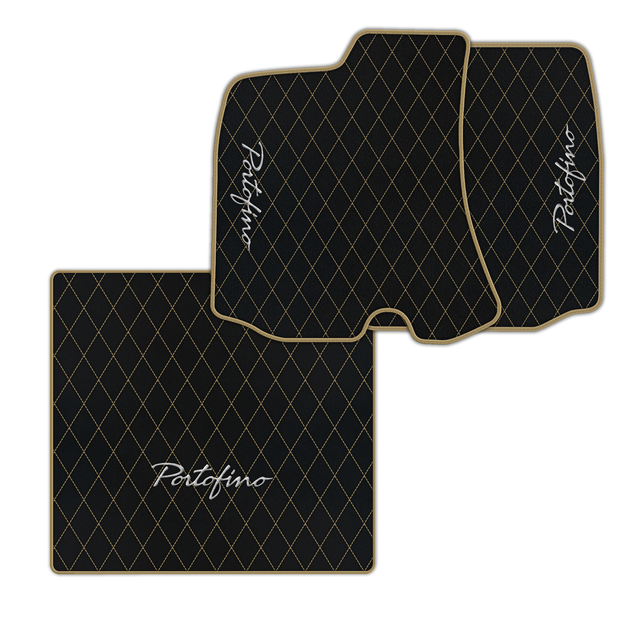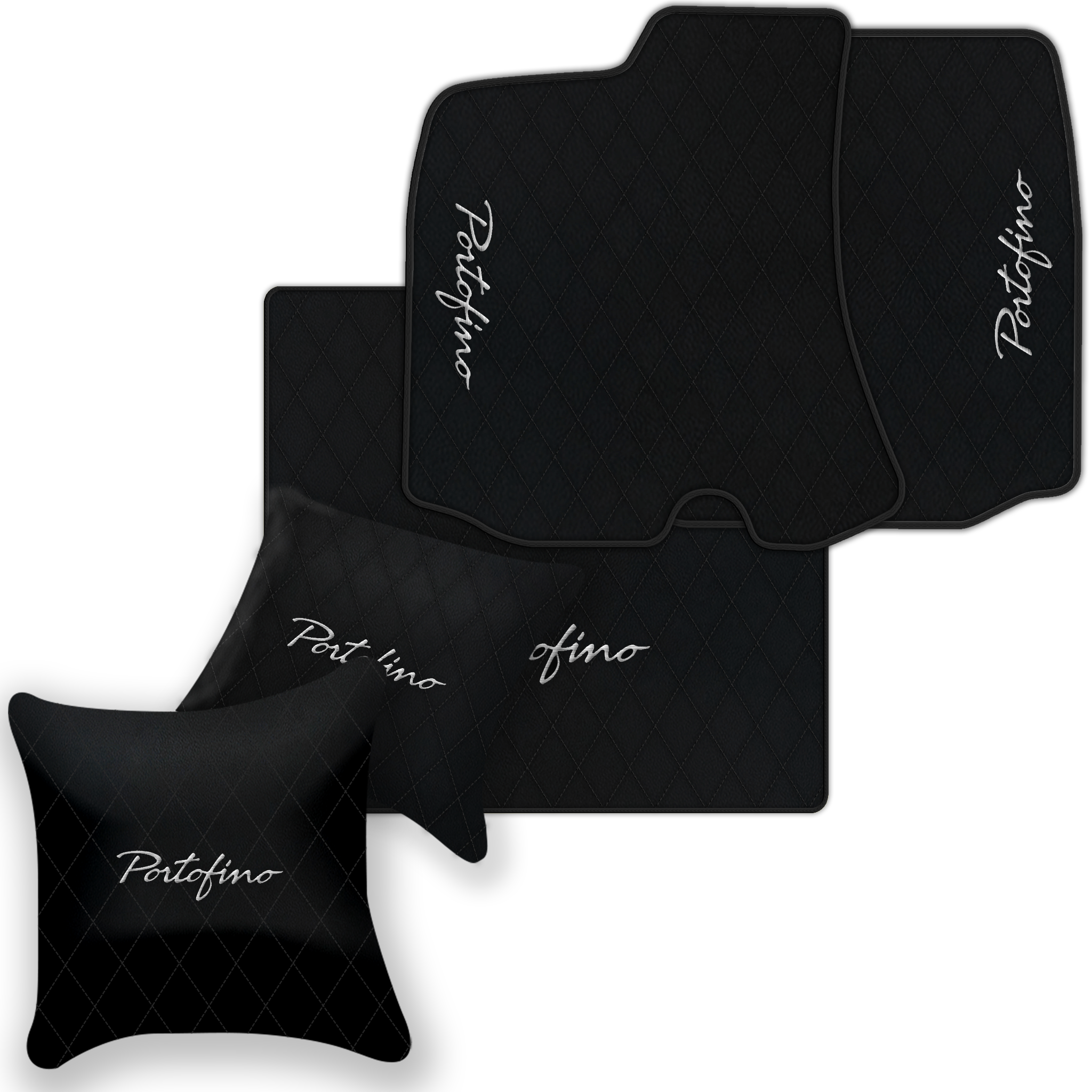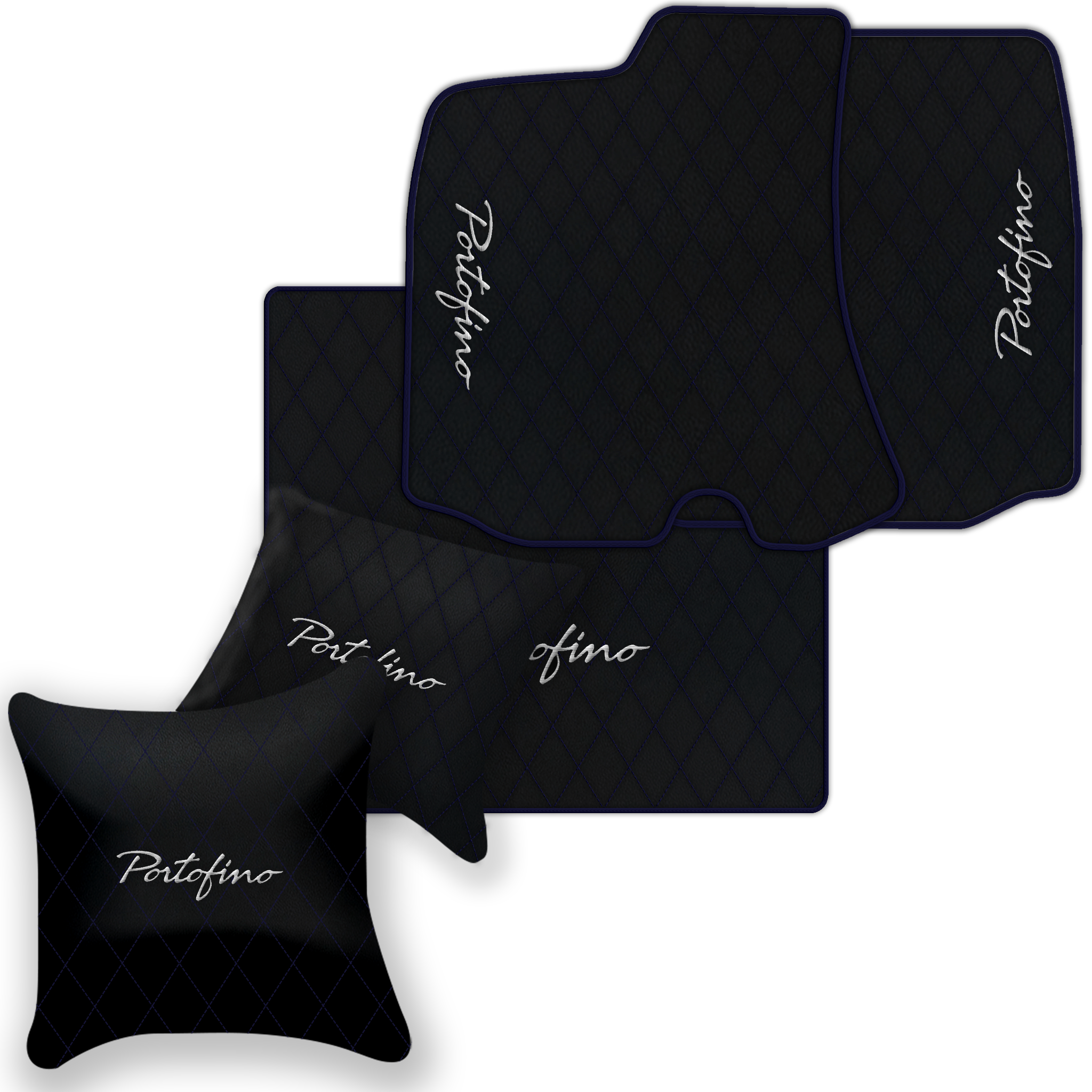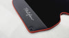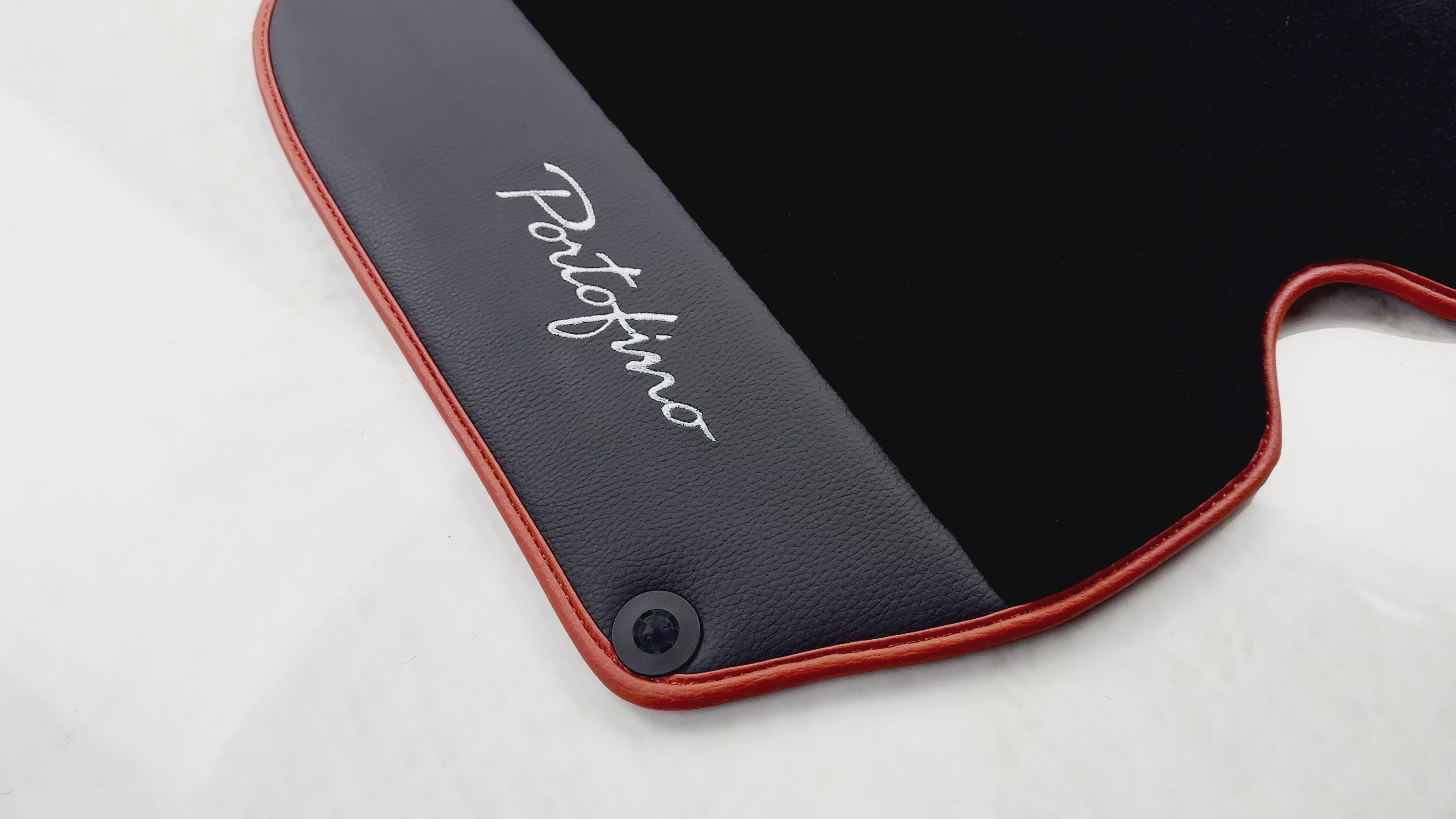 Czarne dywaniki samochodowe do Ferrari Portofino (2018-2023) ze skórą i czerwonym wykończeniem