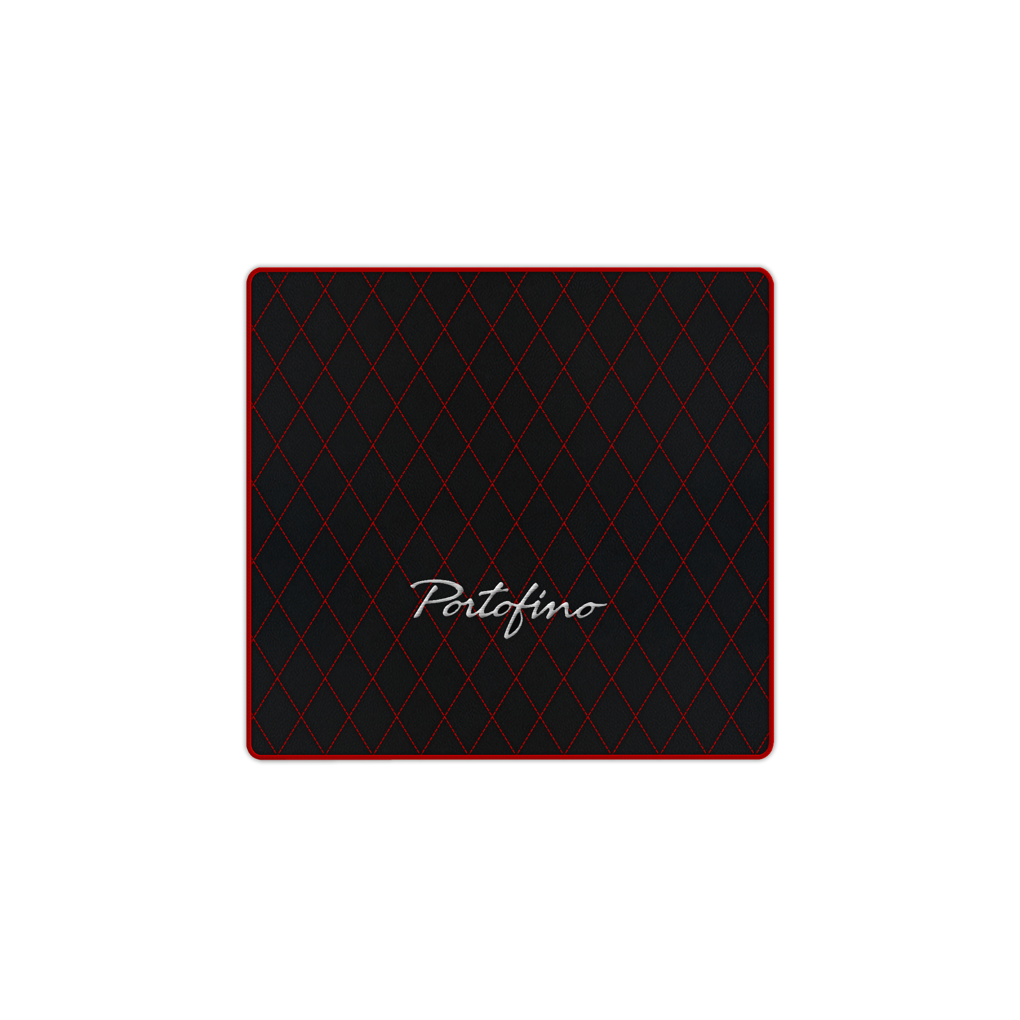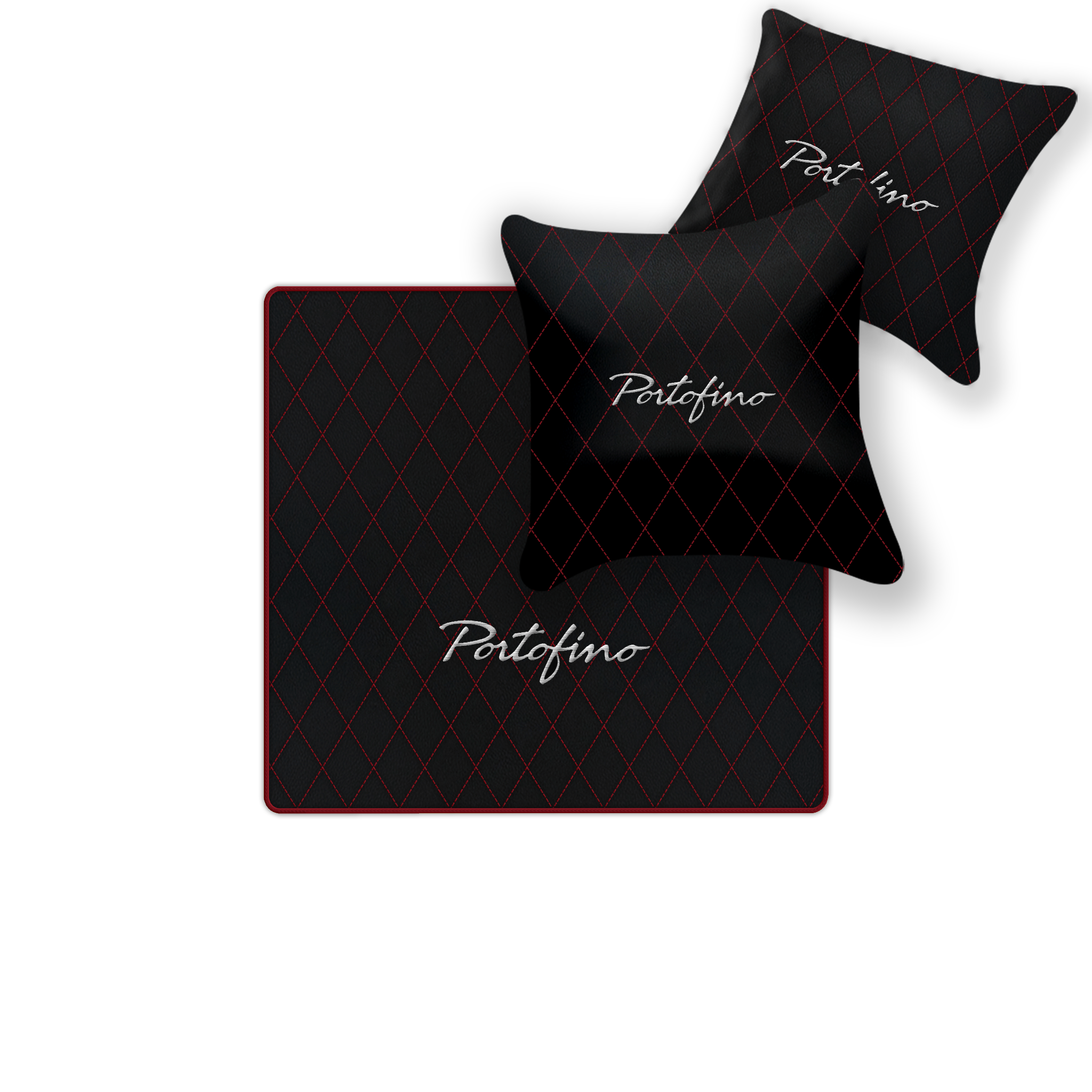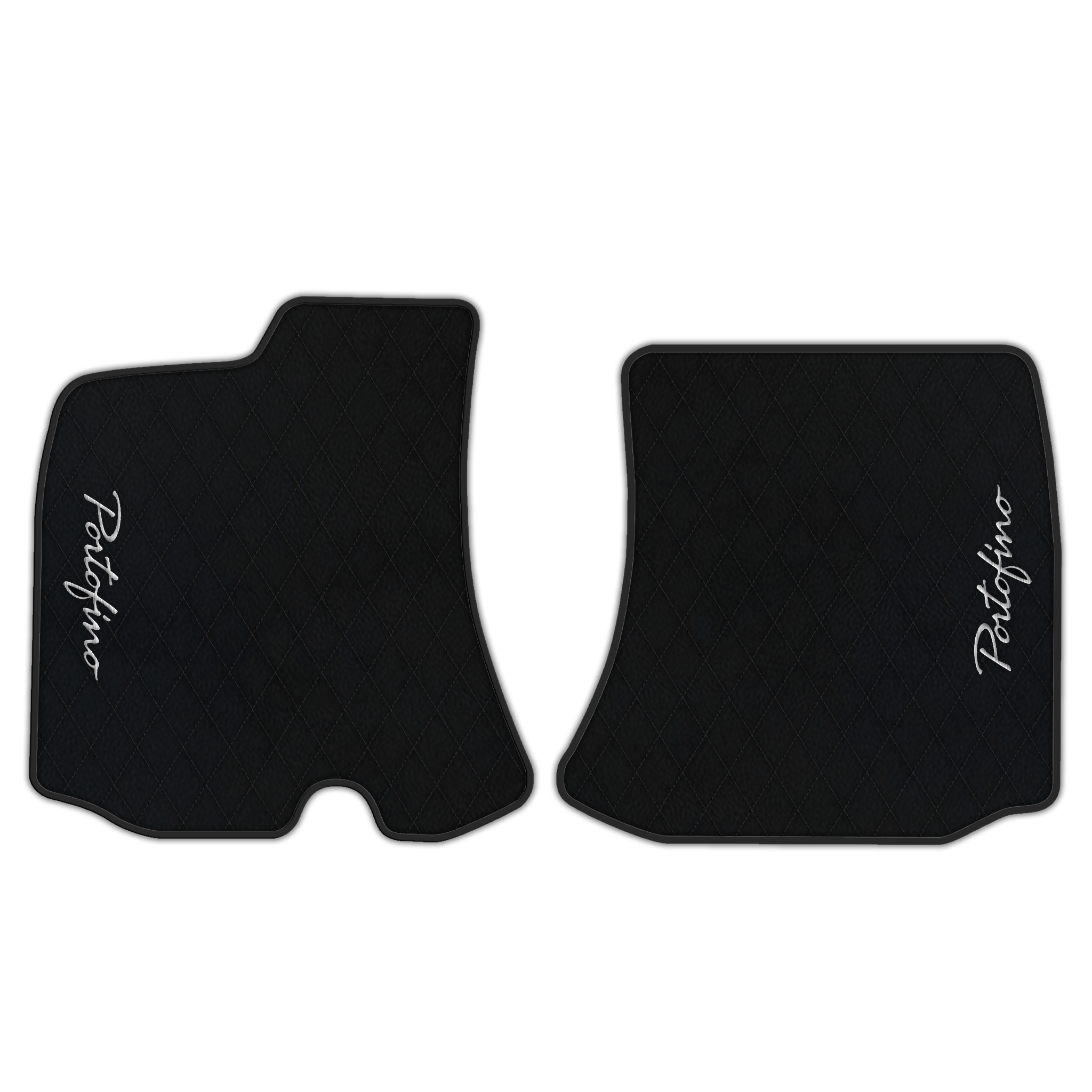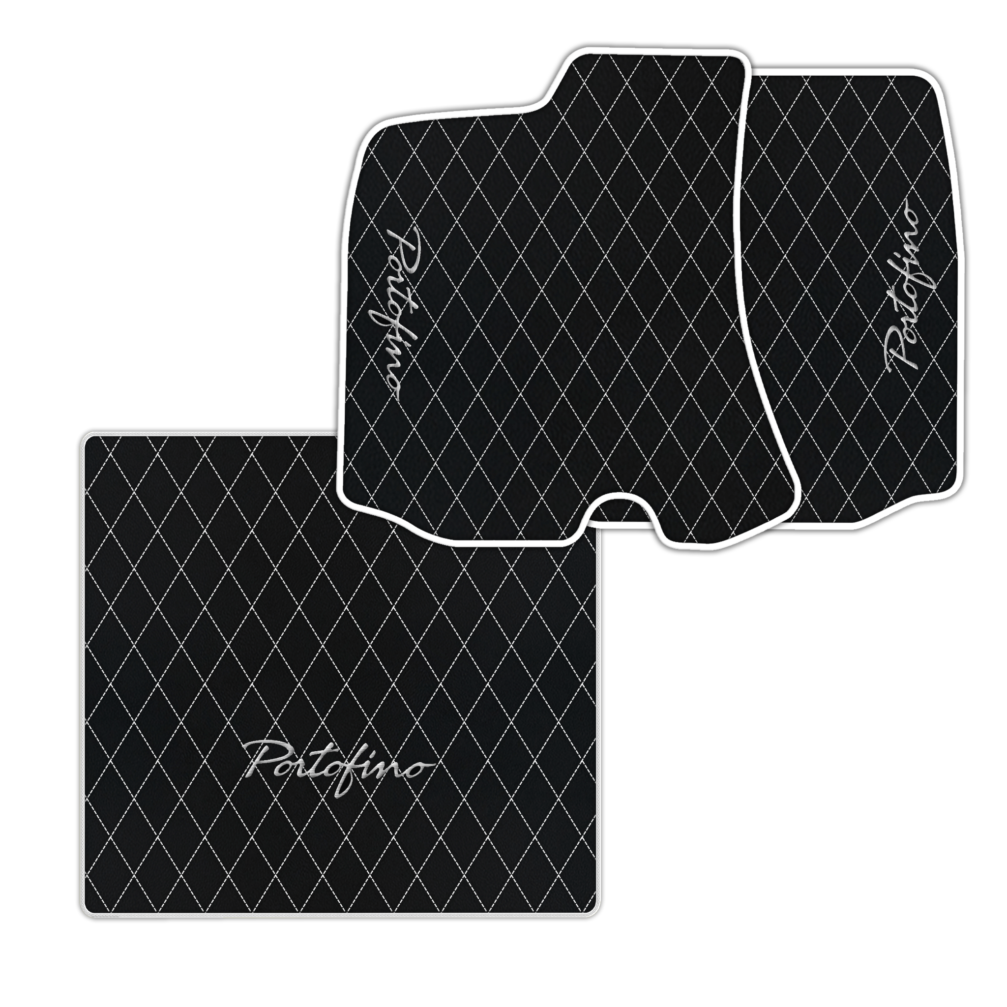 Czarne dywaniki samochodowe do Ferrari Portofino (2018-2023) ze skórą i czerwonym wykończeniem