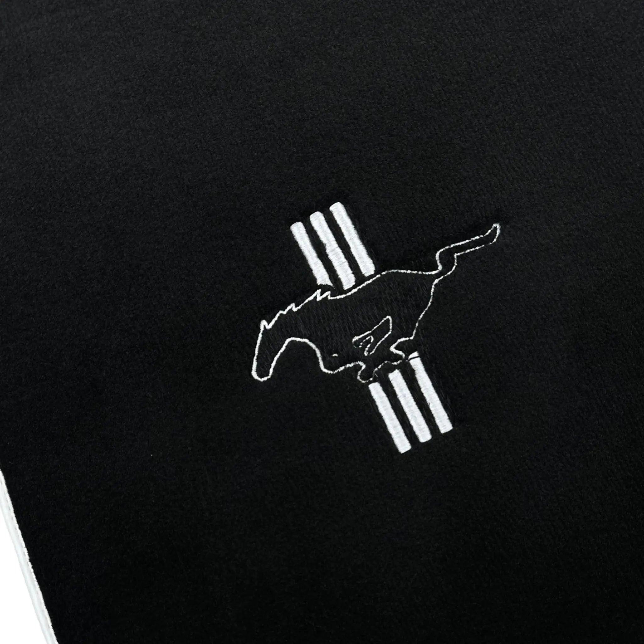 Czarne dywaniki samochodowe z białym wykończeniem do Ford Mustang V (2004-2010) z logo Pony