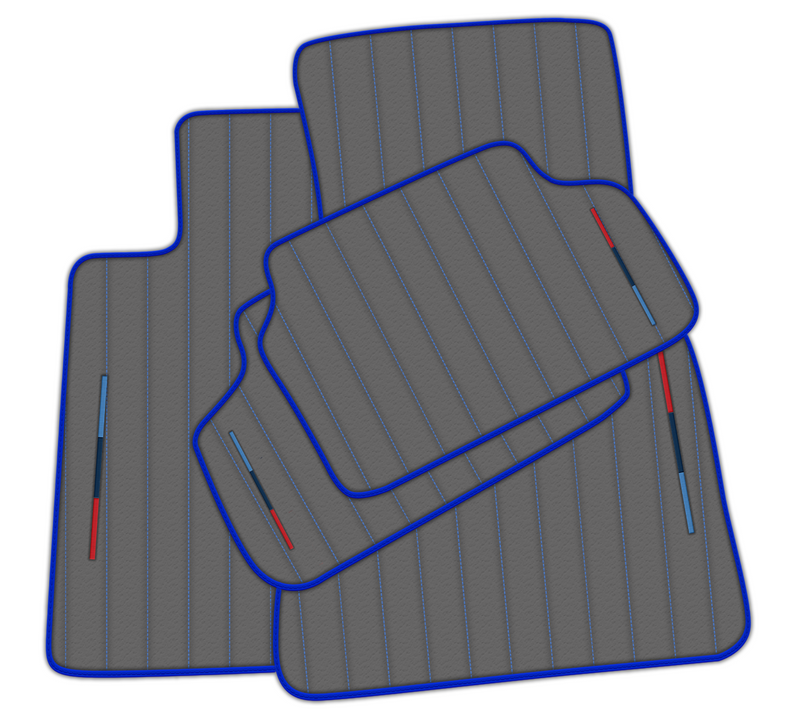 Ulepsz swoją BMW dzięki tym wysokiej jakości szarym skórzanym dywanikom. Oferują nie tylko elegancki i stylowy wygląd z wzorem liniowym i niebieskim przeszyciem, ale także ikoniczny trójkolorowy znak M dla dodatkowej elegancji. Idealne do ochrony wnętrza pojazdu, jednocześnie podnosząc jego wygląd.
